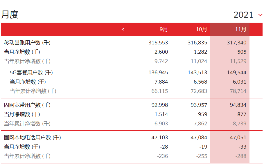 在移动业务方面,中国联通移动出账用户11月净增50.5万户,累计达3.173亿户。其中5G套餐用户11月净增603.1万户,累计达到1.495亿户。