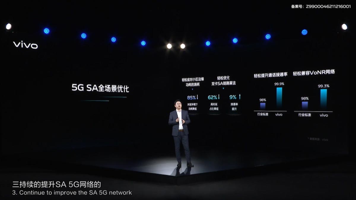 vivo副总裁、vivo AI全球研究院院长周围介绍,vivo在5G协议层面做了多方面优化。专项优化小区切换的乒乓问题,大幅改善5G网络下的接通率和异常功耗问题,经过实测,引入该算法后,乒乓频发的地方,网络卡顿大幅度下降,因此导致的手机功耗异常,降低了85%;持续改善双卡问题,其中高时延的情况,改善了62%,接通率提升9%;持续提升SA 5G网络的电话接通率到99.9%;持续提升VoNR通话接通率到99.3%,超过98%的行业标准。
