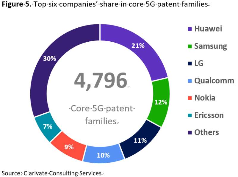5G核心标准必要专利的持有量方面,华为、三星、LG、高通、诺基亚和爱立信等6家公司合计占比达到70%。不出意外,华为以21%拥有量的绝对优势位居榜首。