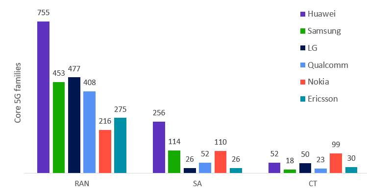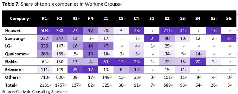 在技术领域分布方面,华为在RAN TSG的5G核心标准必要专利持有量远高于其他公司,在SA TSG和CT TSG领域的5G核心标准必要专利持有量也名列前茅。具体到工作组中,华为在R1、R2、R3、C4、S2、S3和S5等多个工作组中均拥有最多的5G核心专利族。