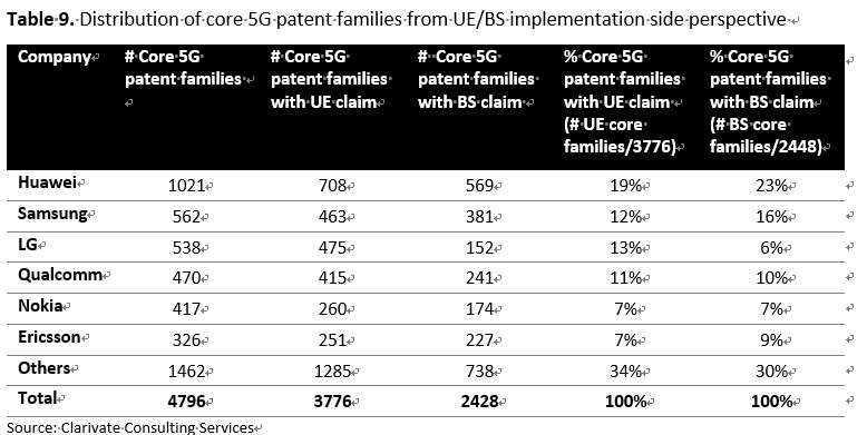 报告显示,5G标准声明专利中4796族为5G核心标准必要专利,占总声明专利的22%。各家供应商中,华为在核心专利的持有量、在声明专利中的占比、重要技术领域、终端/基站侧的分布等多个方面中均领先于其他公司。
