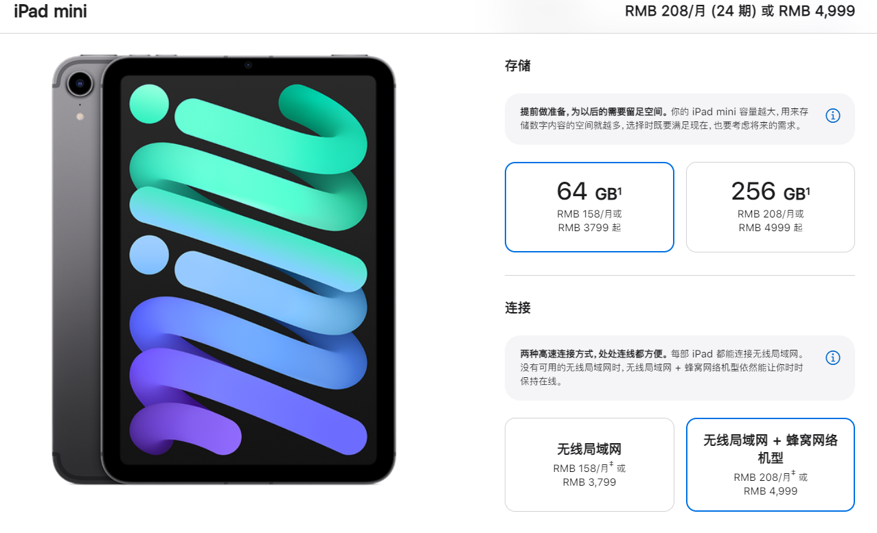 据IT之家网友 @Hanlin7x 投稿,iPad mini 6 WiFi+5G 蜂窝网络版现已在苹果中国官方在线商店上架,64GB 和 256GB 两个版本都已开放购买。