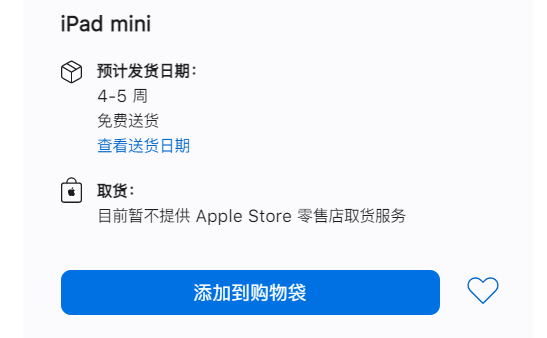 苹果官网显示,iPad mini 6 WiFi+5G 蜂窝网络版购买后预计会在 4~5 周内发货。