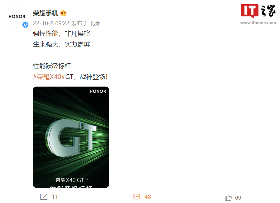 在 9 月 15 日发布 X40 5G 手机后,荣耀手机官方今日上午带来了新机的消息 —— 荣耀 X40 GT 即将登场。