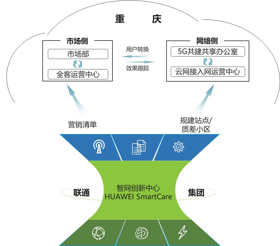 采用HUAWEI SmartCare系统机网套功能月度输出的高潜营销用户和网络侧数据,市场侧负责制定营销策略,组织外呼团队对营销用户执行业网外呼并统计外呼情况、网络侧负责规划建设落地及质差小区优化闭环并跟踪用户转化效果。市场和网络侧以此协同运作发展5G业务。