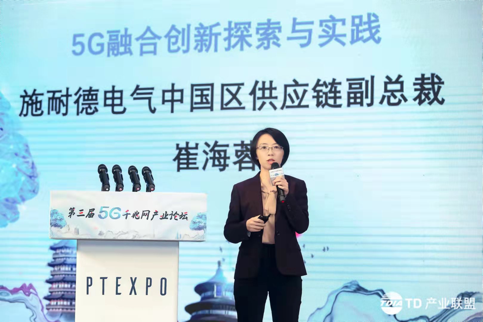 施耐德电气中国区供应链副总裁崔海蓉分享了施耐德电气在5G融合创新的探索与实践,认为千兆5G具有诸多价值和优势,能满足柔性制造,全程全网,工业控制,精准定位等各类的企业诉求。
