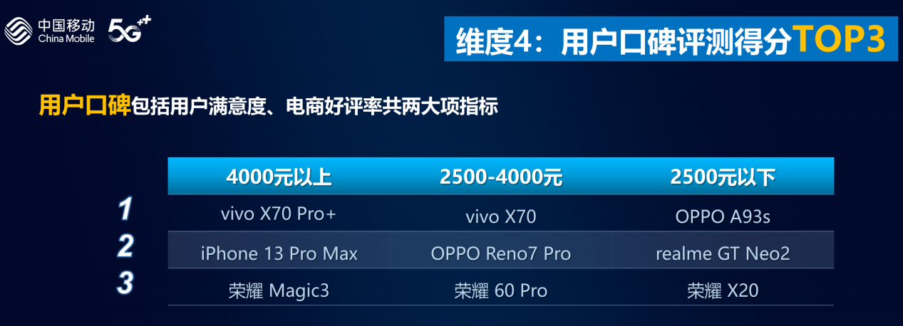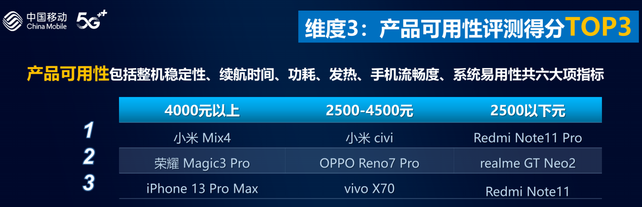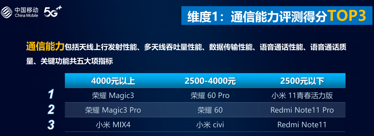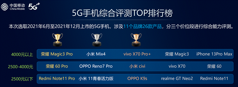 报告指出,随着5G SA技术日益成熟,5G手机软硬件持续升级,体验持续提升。其中,荣耀Magic3 Pro、荣耀60 Pro和Redmi Note11 Pro分别斩获三个挡位的冠军。