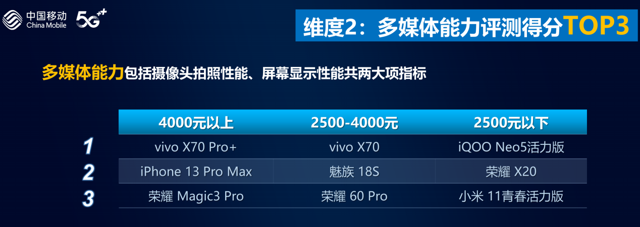 多媒体能力包括摄像头拍照性能、屏幕显示性能两大指标。屏幕方面,三星AMOLED屏幕综合显示素质好,vivo X70 Pro+屏幕显示最佳;摄像头方面:厂商加强光学制造商合作,采用高品质摄像头,助力提升用户影像体验;高倍变焦、夜景、广角拍摄、防抖动性能及人像拍摄背景虚化等技术逐步普及,各厂家产品均相比前代产品有不小进步。