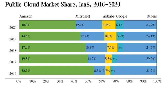 IT之家了解到,Gartner 在今年5月发布的数据显示,2020年全球云计算市场保持高速增长,IaaS 市场规模达642.86亿美元,同比增长40.7%。