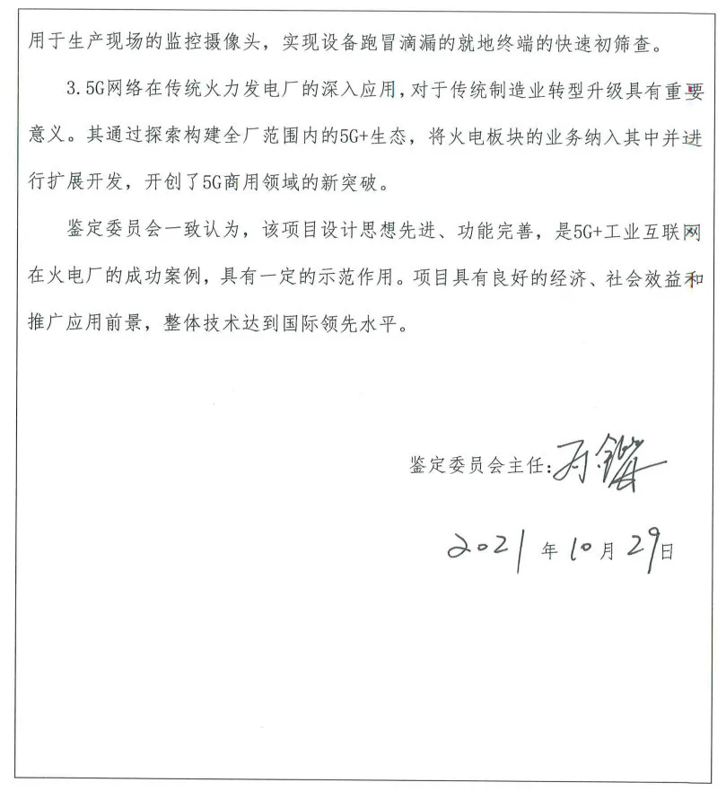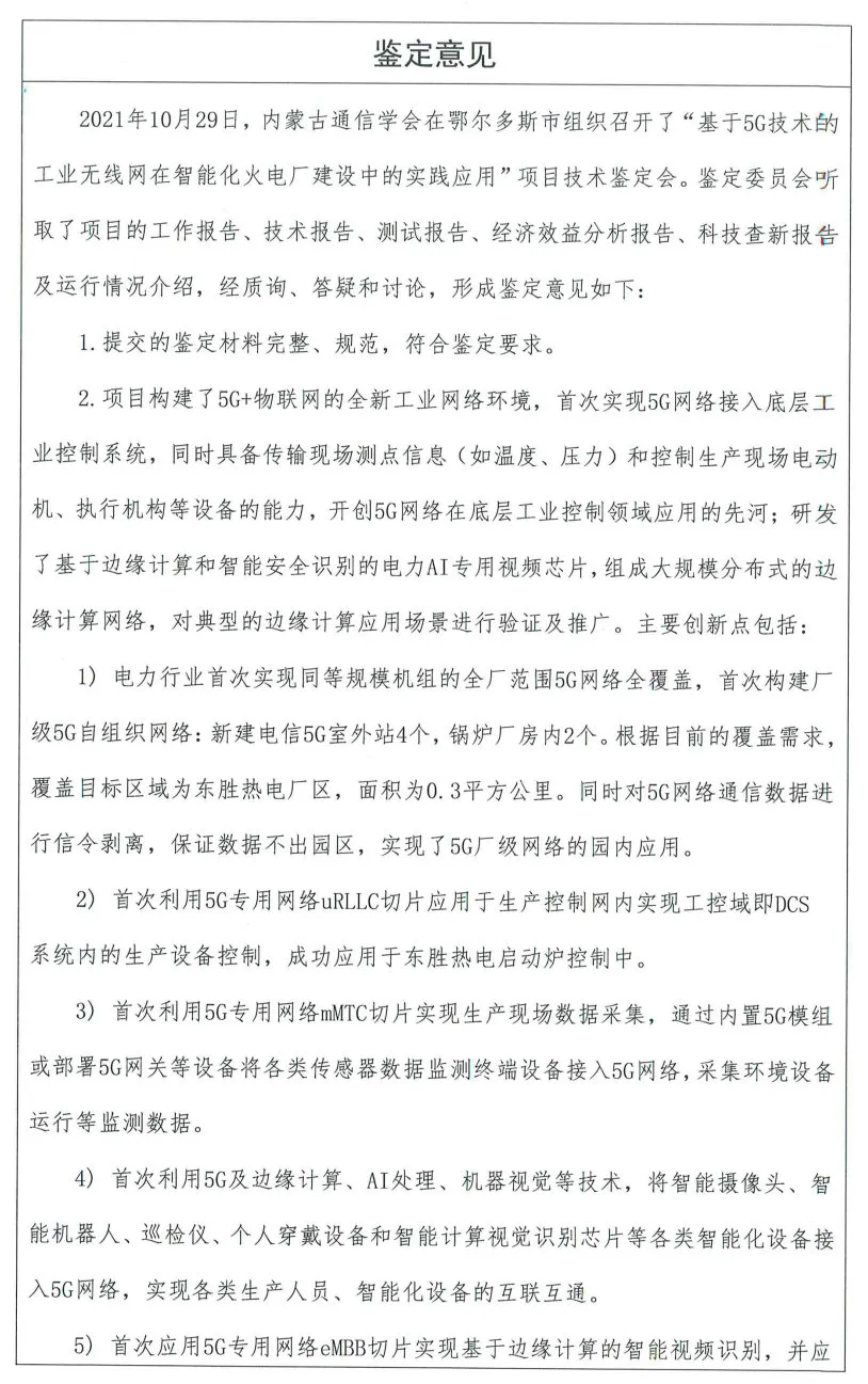 附图 鉴定意见—基于5G技术的工业无线网在智能化火电厂建设中的实践应用