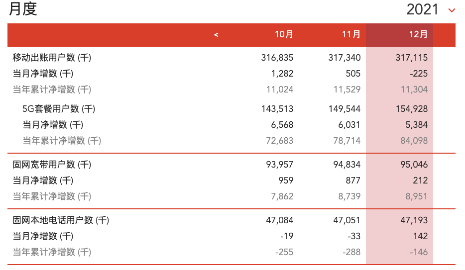 在移动业务方面,中国联通移动出账用户12月净减22.5万户,累计达3.171亿户。其中5G套餐用户12月净增538.4万户,累计达到1.549亿户。