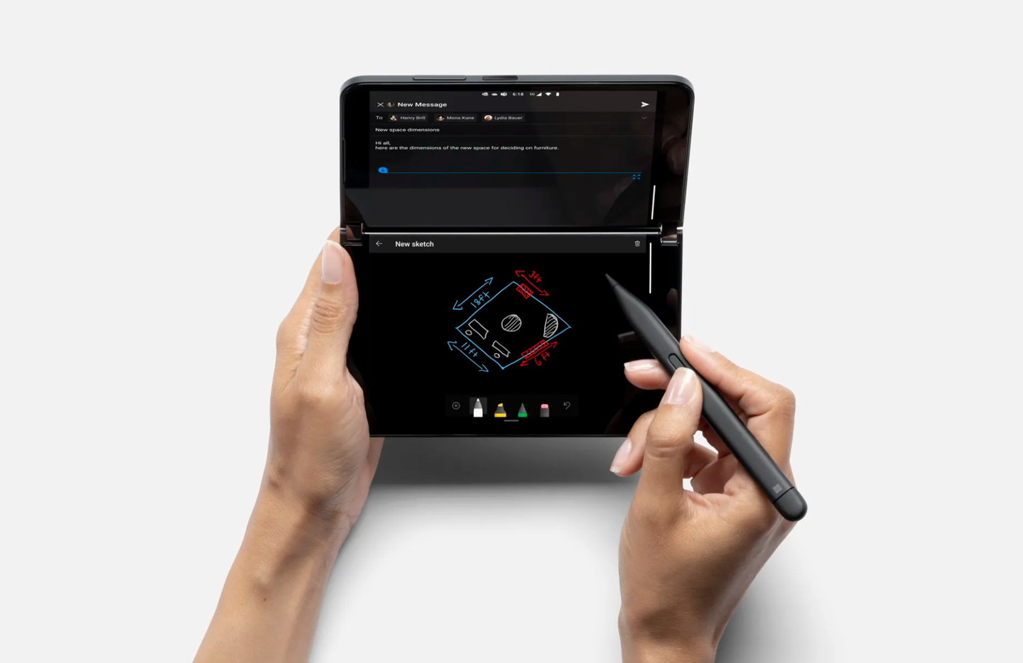 与之前的 Surface Duo 一样,Surface Duo 2 支持用微软 Surface Pen 系列进行手写笔输入。你可以用磁铁将新的 Surface Slim Pen 2 贴在 Surface Duo 2 的外部,使其在旅途中随身携带。