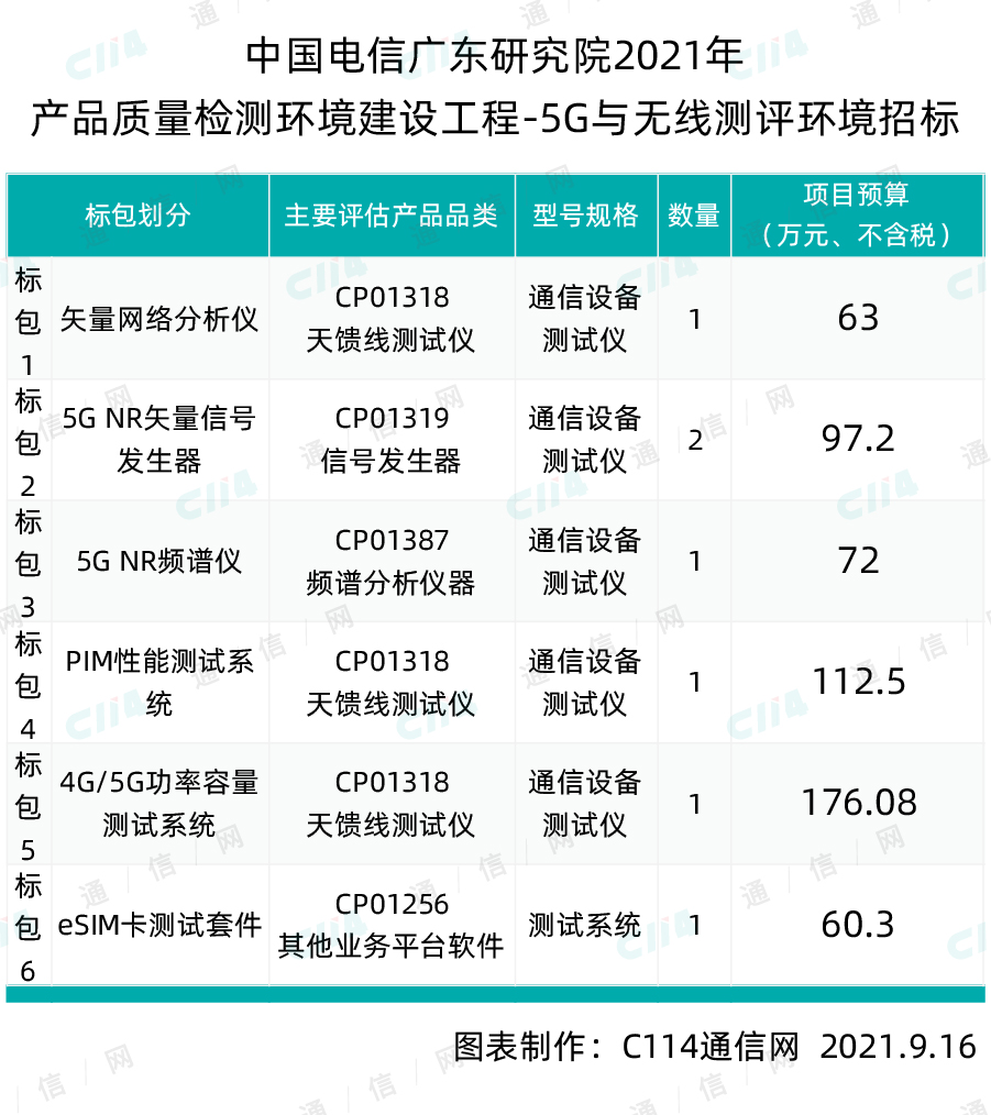 C1114讯 9月16日消息(焦焦)从中国电信官网获悉,中国电信广东研究院于昨日启动2021年中国电信广东研究院2021年产品质量检测环境建设工程-5G与无线测评环境招标。