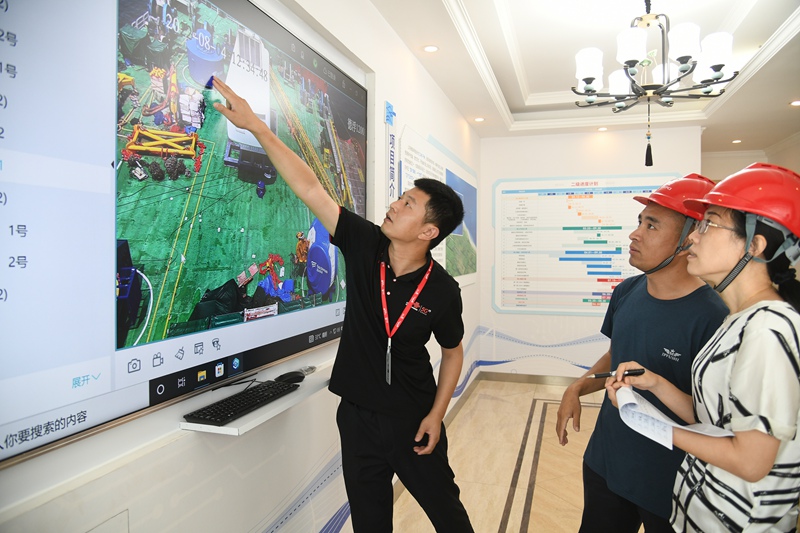 图为在距离施工现场120公里以外的项目指挥中心,潍坊联通工作人员和项目安检人员共同商讨,进一步完善人工智能监管视频覆盖角度,确保视频覆盖无死角。