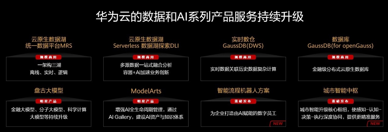 在AI领域,华为云持续升级一站式AI开发平台ModelArts,加强知识计算、图引擎、多模态、端云协同等技术应用,并打造了沉淀大量行业知识和数据的盘古AI大模型,开创“工业化”AI开发新范式,推动AI行业快速落地。