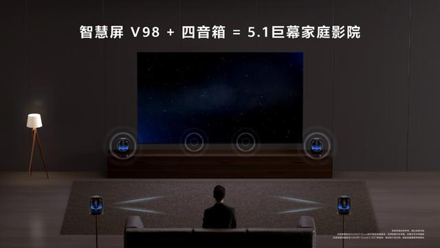 华为智慧屏 V98配合新一代HUAWEI Sound X即可组合成全新的分布式音响系统,打破了多个硬件设备的物理空间限制,让智慧屏与智能音箱同时发声,带来更加沉浸的多声道环绕立体声体验,支持前置左右声道、后置左右环绕两种模式,动态时延校准,在观影时能够实时根据各设备间的播放进度进行动态时延同步,带来100ms级的无感知音画同步效果,真正做到音画合一。未来更是可以升级支持和四个新一代HUAWEI Sound X一起组建5.1家庭影院系统。
