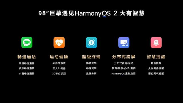 7月29日,华为首款98英寸智慧屏产品正式发布。作为华为迄今为止最大的智慧屏新品,华为智慧屏 V98重点聚焦家庭观影、亲情沟通、家庭娱乐、运动健身等场景,搭载HarmonyOS 2,带来多方畅连、超级终端、智慧提醒等智慧功能,以智慧革新家庭生活新方式。