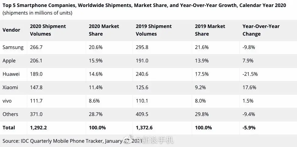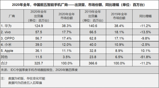 根据IDC中国季度手机市场跟踪报告,2020年国内手机市场整体出货量约3.26亿台,同比下降11.2%。然而在市场总量减少的情况下,前五大厂商出货量合计占比由2019年的93.5%提升至96.5%,行业集中度进一步提升。