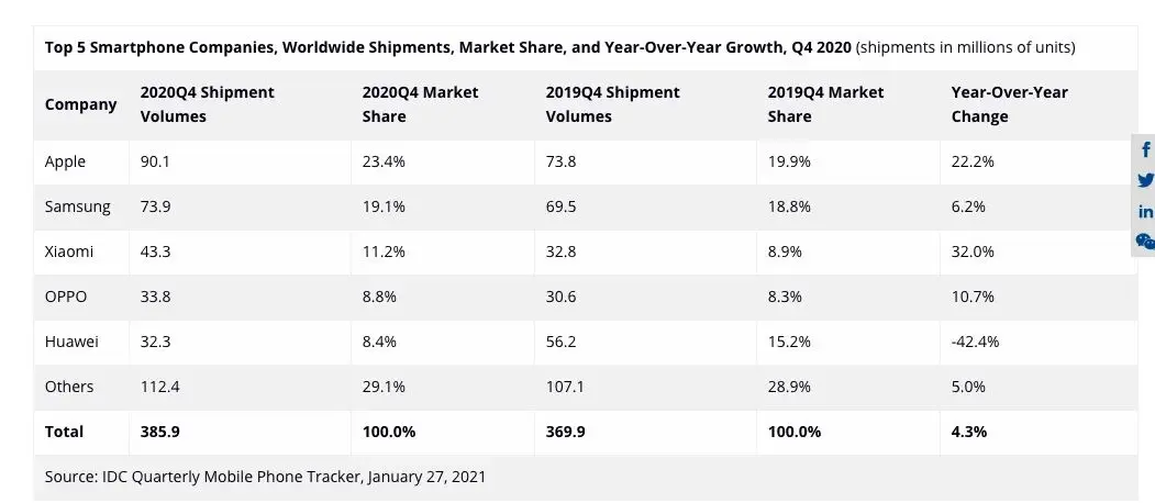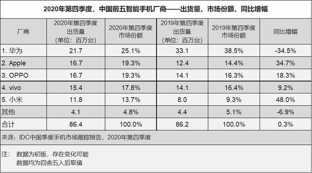 由于众所周知的原因,华为手机的出货量在艰难挺过2020年上半年后,在Q4开始出现了断崖式的下跌。而其余四家头部厂商均出现了不同程度的增长,其中小米甚至出现了高达48%的增长。由此可见,华为空出的国内手机市场,线下的高端手机由Apple接盘,中低端手机由OV接盘。而华为的线上销售(主要是已经被剥离出售的荣耀品牌),基本由小米来接盘。
