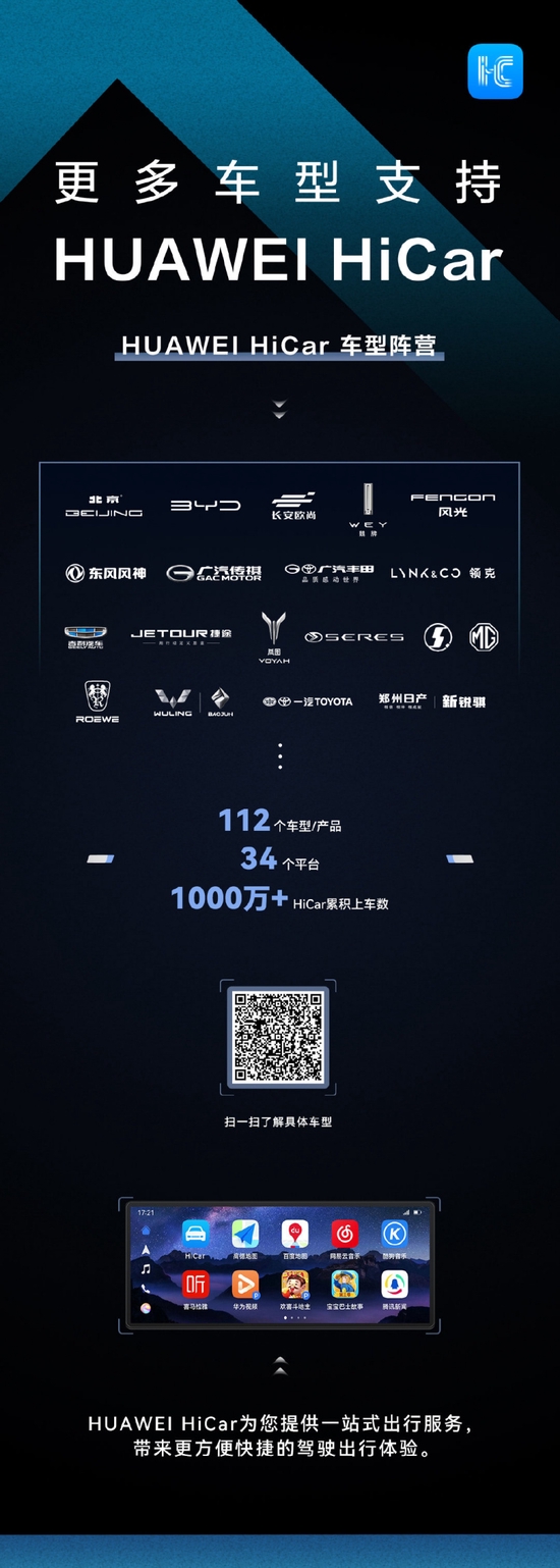 华为方面近日宣布,华为 Hicar 累计上车数已经达到 1000 万 +,涉及 34 个平台和 112 个车型 / 产品。