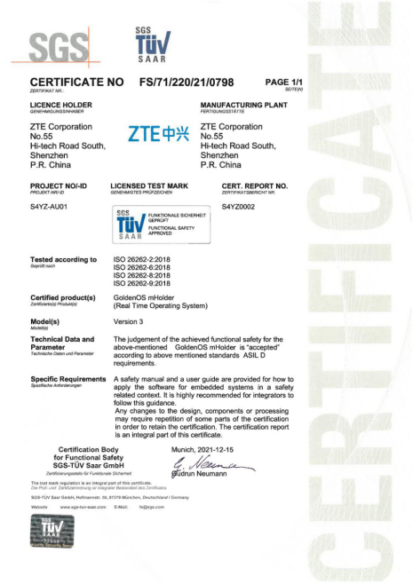 近日,SGS通标标准技术服务有限公司向中兴通讯股份有限公司汽车操作系统GoldenOS微内核产品颁发了ISO 26262 ASIL-D级汽车功能安全产品认证证书。此认证是业界最高等级认证,标志着中兴通讯汽车操作系统已能够全面支撑汽车行业最为严苛的功能安全场景需求。