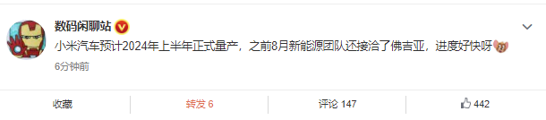 此外,数码博主 @数码闲聊站 透露今年 8 月,小米新能源团队还接洽了法国汽车零配件供应商佛吉亚(Faurecia),预计小米造车进展将再一次提速。