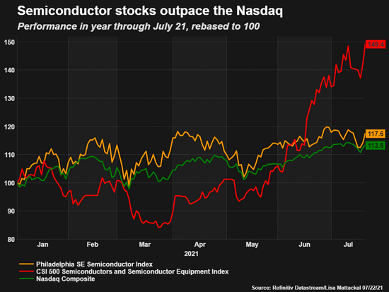自进入2021年以来,费城半导体指数的涨幅(16%)已经超过了纳斯达克综合指数(13%)。