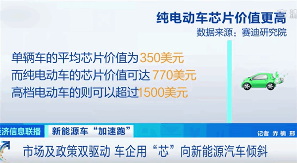 此外,从单辆车来看,新能源汽车的芯片使用量要比传统燃油车更多。数据显示,目前,单辆车的平均芯片价值为350美元(约合人民币2200元左右),而纯电动车的芯片价值可达770美元,高档电动车的则可以超过1500美元。