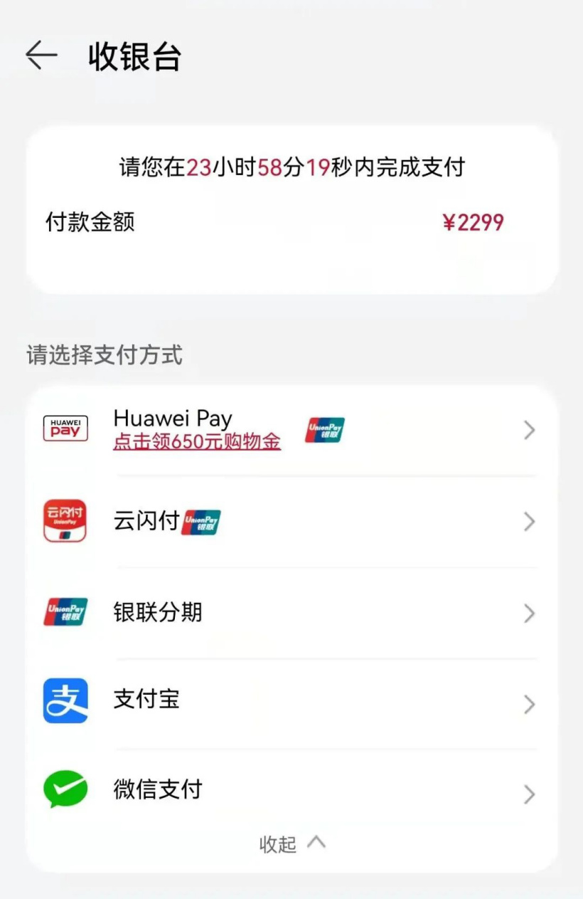 在商户 App 收银台中选择 HuaweiPay 等手机闪付支付方式