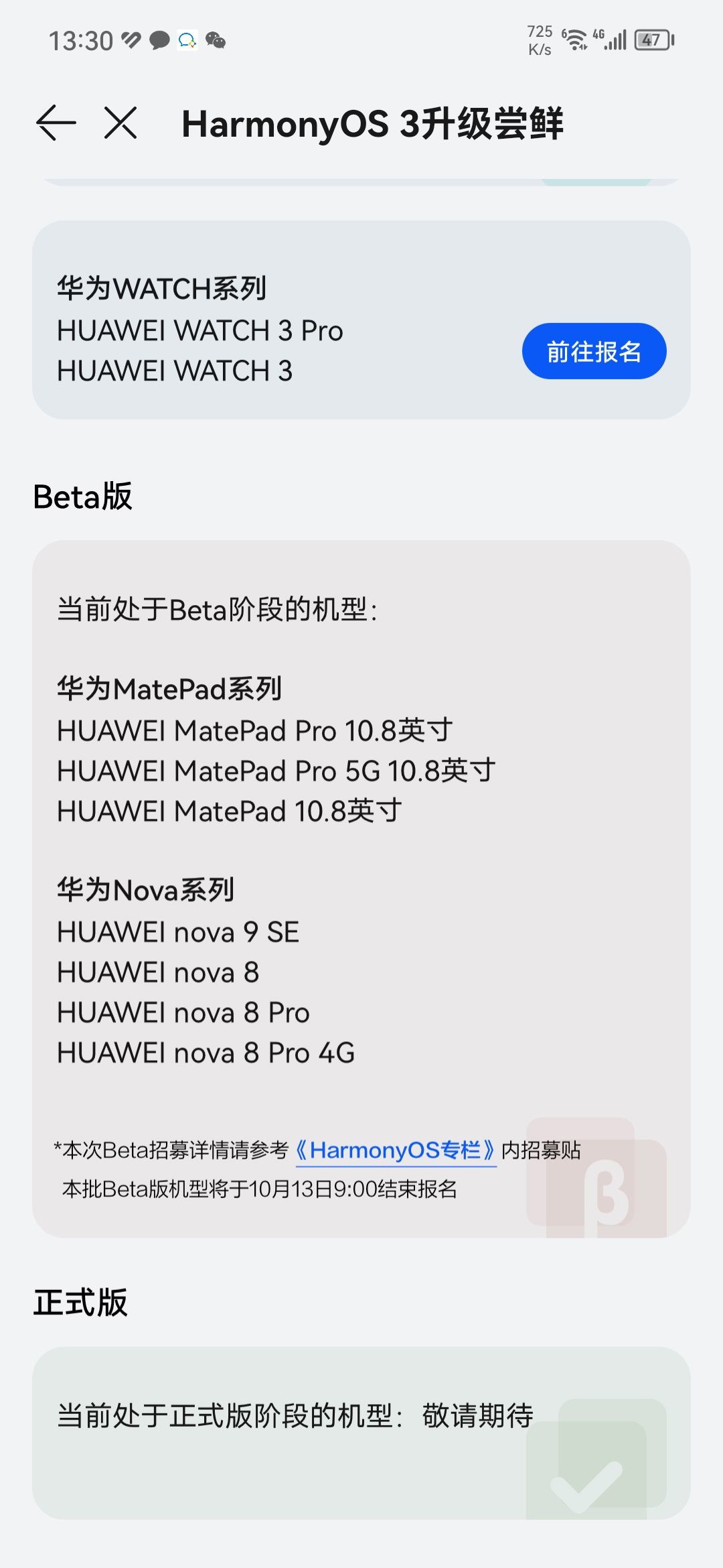 华为 MatePad Pro 10.8 英寸、MatePad Pro 5G 10.8 英寸、MatePad 10.8 英寸、华为 nova 8/ nova 8 Pro 4G / 5G 以及 nova 9 SE 现已开启鸿蒙 HarmonyOS 3 Beta 版尝鲜招募,截止 10 月 13 日 9:00。