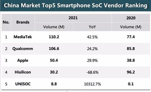据悉,2021年榜单前五分别为联发科、高通、苹果、海思和紫光展锐。其中,联发科全年出货量达1.1亿颗,同比增长42.5%。从去年的略小于高通,变为今年对高通的小幅领先,成功登顶。