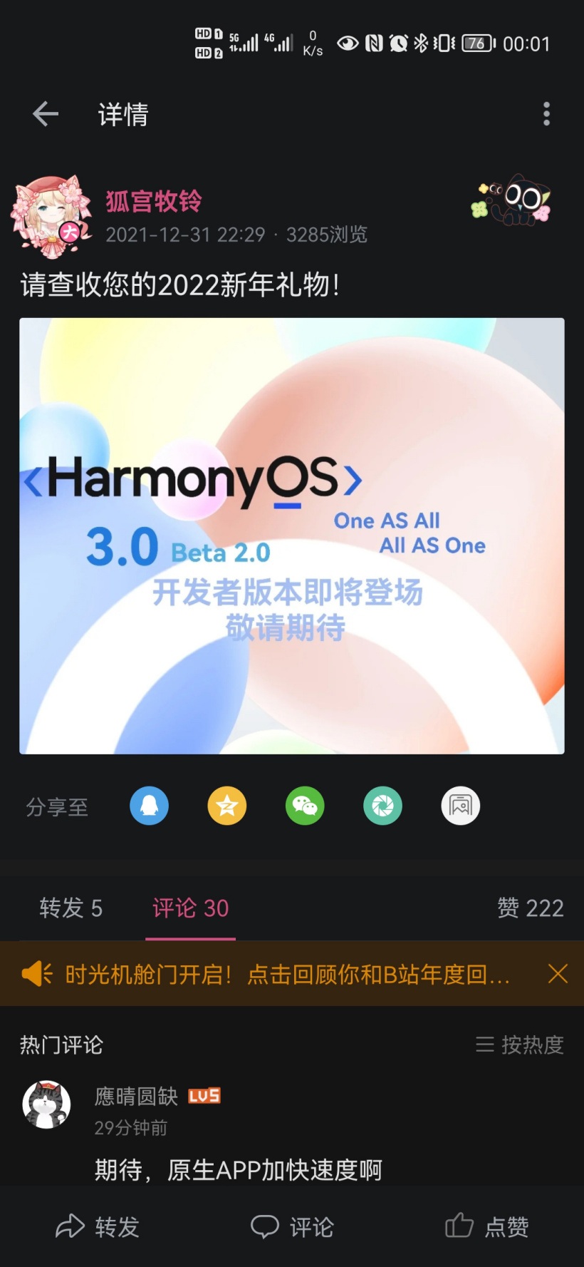 据B站UP 主 @狐宫牧铃 透露,2022 年的新年礼物要来了,HarmonyOS 3.0 Beta 2 开发者预览版即将登场,敬请期待。