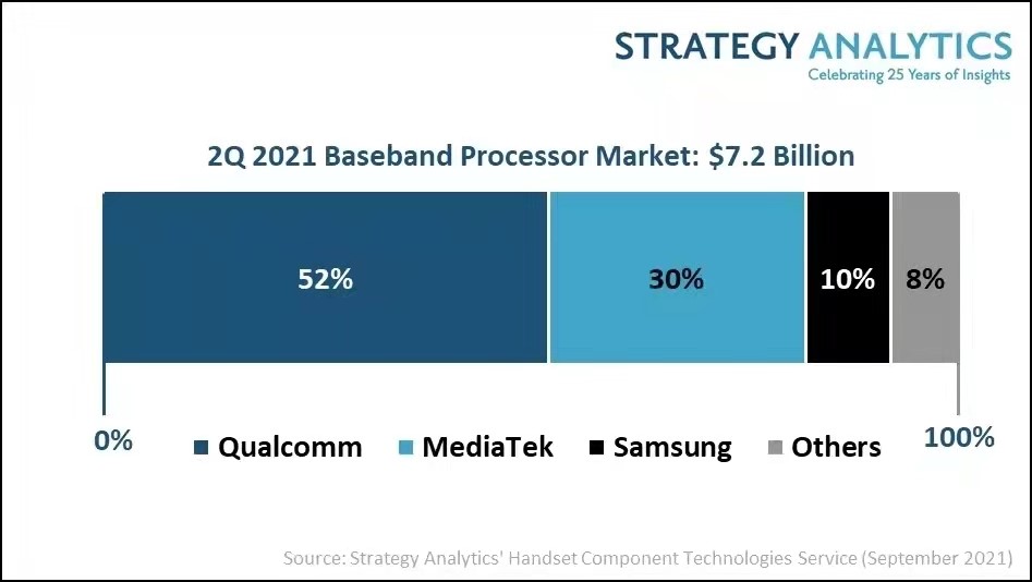报告指出,2021年Q2,高通以52%的收入份额在基带芯片市场遥遥领先,其次是联发科(30%)、三星LSI(10%)。尽管面临联发科的激烈竞争,但高通仍以68%的出货量份额领先5G基带芯片市场。由于与智能手机OEM厂商和半导体代工厂的密切关系,高通在2021年Q2的5G基带芯片出货量连续第三季度超过1亿。