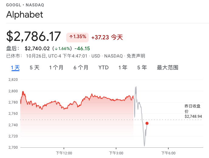 Alphabet A 类股 (NASDAQ: GOOGL) 周二在纳斯达克交易所的开盘价为 2785.27 美元。截至周二收盘,Alphabet 股价上涨 37.23 美元,报收于 2786.17 美元,涨幅为 1.35%。截至美国东部时间周二 16:47 分 (北京时间周三 4:47 分),Alphabet 股价在盘后交易中下跌 46.15 美元至 2740.02 美元,跌幅为 1.66%。过去 52 周,Alphabet 股价最高为 2925.08 美元,最低为 1508.48 美元。