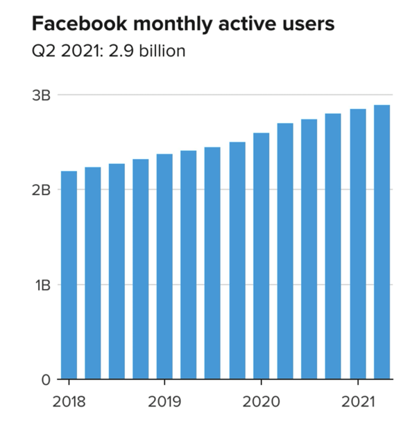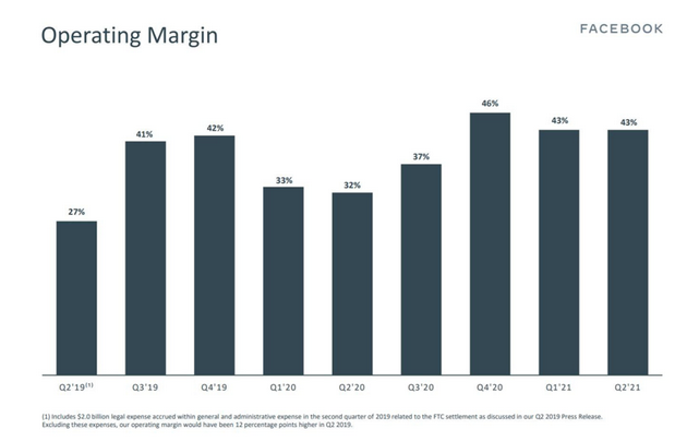 与此同时,Facebook的运营利润率也从上年同期的32%急剧提升到43%,增长了11个百分点。这主要是因为去年的疫情影响到了营收以及Facebook在疫情期间加大了研发投入。过去三个季度,Facebook的利润率都超过了40%。