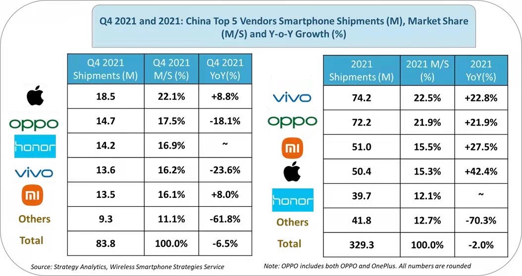 2021年Q4,排名中国智能手机出货量前五的厂商分别为:苹果、OPPO、荣耀、vivo、小米。其中,苹果手机在2021年Q4以1850万台出货量、22%的创纪录市场份额首次登顶中国智能手机市场。