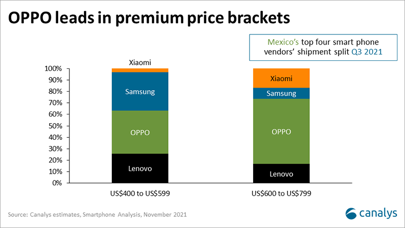 IT之家获悉,OPPO 在 2021 年第三季度,已成为墨西哥第四大手机厂商,市场份额 12%,出货量同比增长数十倍。根据 Canalys 统计,在 400-799 美元价位段,OPPO 手机的占有率获得了冠军。