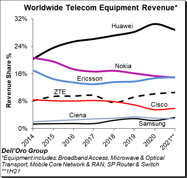 北京时间9月14日消息(艾斯)市场研究公司Dell’Oro Group刚刚发布了2021年上半年全球整体电信设备市场报告。这份报告涵盖包括宽带接入、微波与光传输、移动核心网和无线接入网(RAN)、SP路由器和运营商以太网交换机在内的整个电信设备市场。