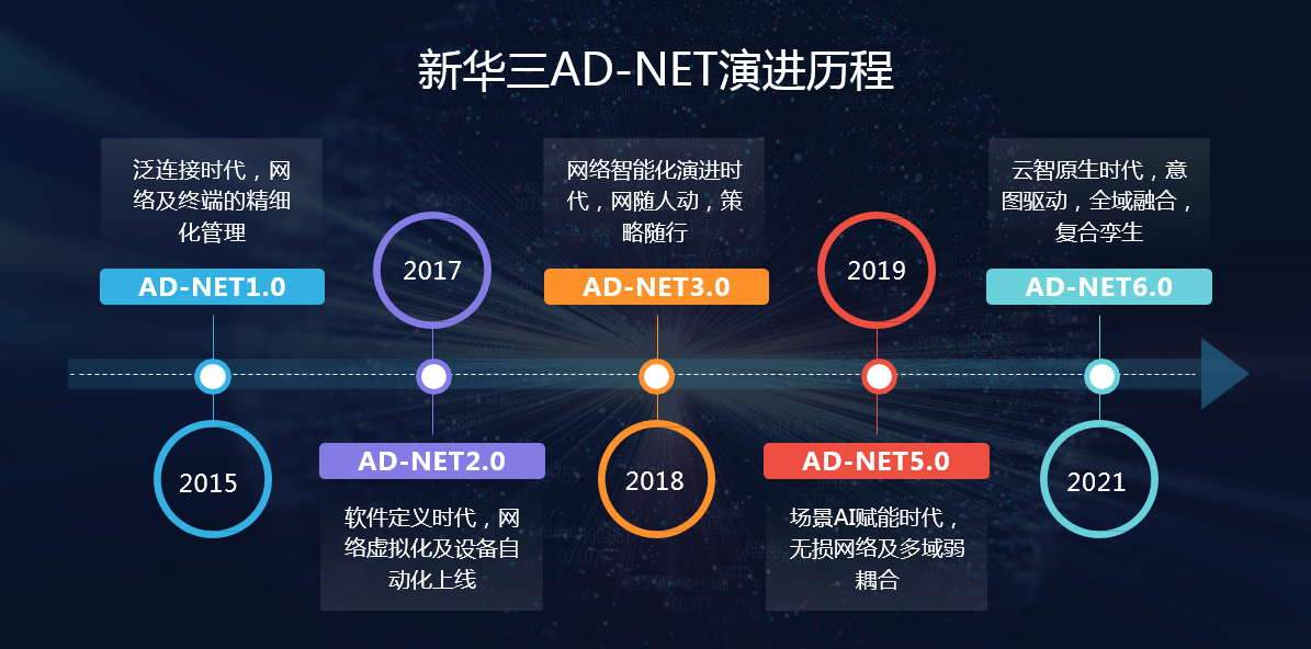 2015年的AD-NET 1.0,应对泛连接时代网络及终端的精细化管理需求;2017年的AD-NET 2.0,提出全网自动化概念,解决软件定义及场景化的问题;2018年的AD-NET 3.0,将网络与AI融合,实现了网随人动,策略随行方案的创新落地;2019年的AD-NET 5.0,引入全场景AI赋能,实现了无损网络及多域弱耦合方案的交付,全面实现连接性向智能性转变。
