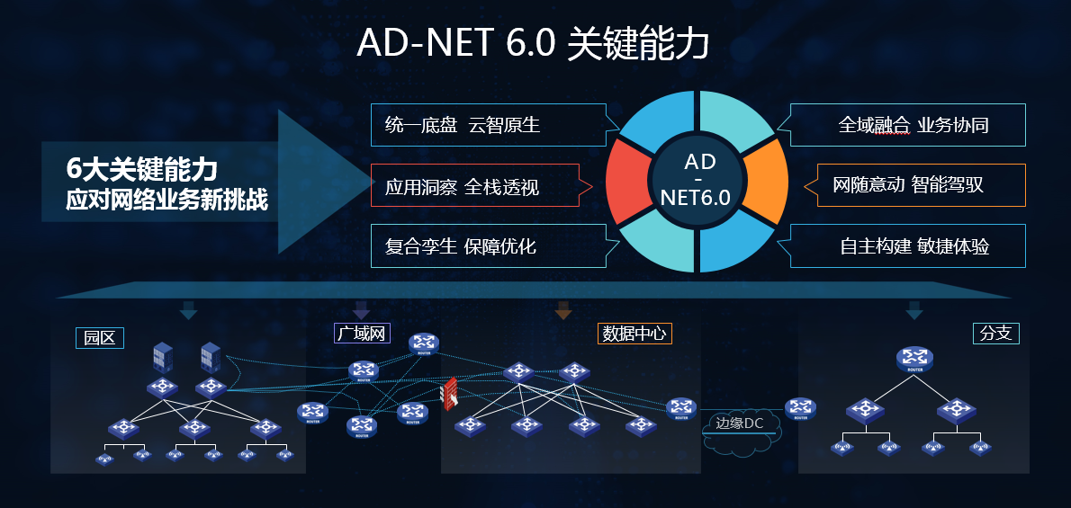 王斌介绍,AD-NET 6.0具备六大关键能力,统一底盘实现云智原生;全域融合保障业务协同;应用洞察提供全栈透视;网随意动推进智能驾驭;复合孪生赋能保障优化;自主构建支撑敏捷体验。“作为新华三智能联接战略的核心中枢和基石,AD-NET 6.0的六大关键能力将很好地顺应智能、融合、极简、可信、超宽的智能联接五大要素。”