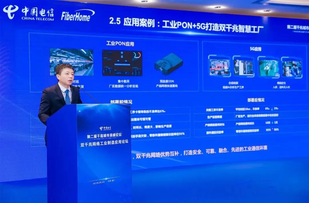 2月15日,在第二届千兆城市峰会期间举办的双千兆网络工业制造应用论坛上,烽火通信宽带业务产出线副总裁李明发表了《千兆光网助力工厂数字化转型》的主题演讲。