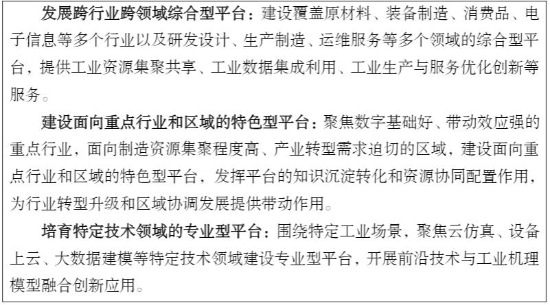 企业培育具有竞争力的工业互联网平台企业,建设一批跨行业跨领域的综合型平台、面向重点行业和区域的特色型平台以及面向特定技术和场景的专业型平台,强化工业大数据开发、制造资源配置和解决方案汇聚能力,加快工业知识的沉淀、传播和复用,打造基于平台的制造业新生态。促进平台间互联互通,通过制定平台间数据迁移标准,探索工业机理模型、微服务、工业APP的跨平台部署和调用机制,实现平台间的数据互通、能力协同与服务共享。