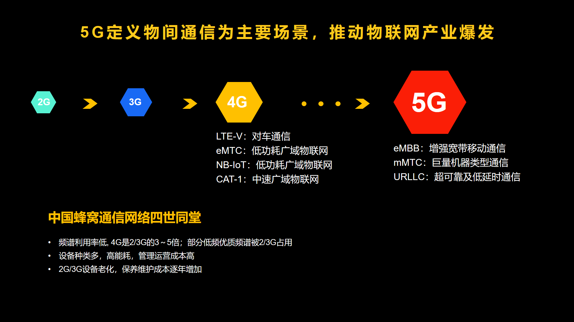 当前,蜂窝通信网络呈现了四世同堂的局面, 2G/3G 加速向4G/5G转网已是大势所趋。4G时代开始出现针对物联网场景的通信标准,比如NB-IoT低功耗广域物联网、比如Cat.1中速广域物联网等;然而这些标准大多也都是在人联网的基础上逐步演变而来的。5G可谓是第一次为物联网而生的通信制式:5G拥有三大场景: eMBB追求极致大宽带移动通信体验,是5G三大场景里最先实现商用的一个;uRLLC提供极低时延和高可靠性,是5G面向行业连接应用的关键杀手锏;mMTC则构建万物互联。