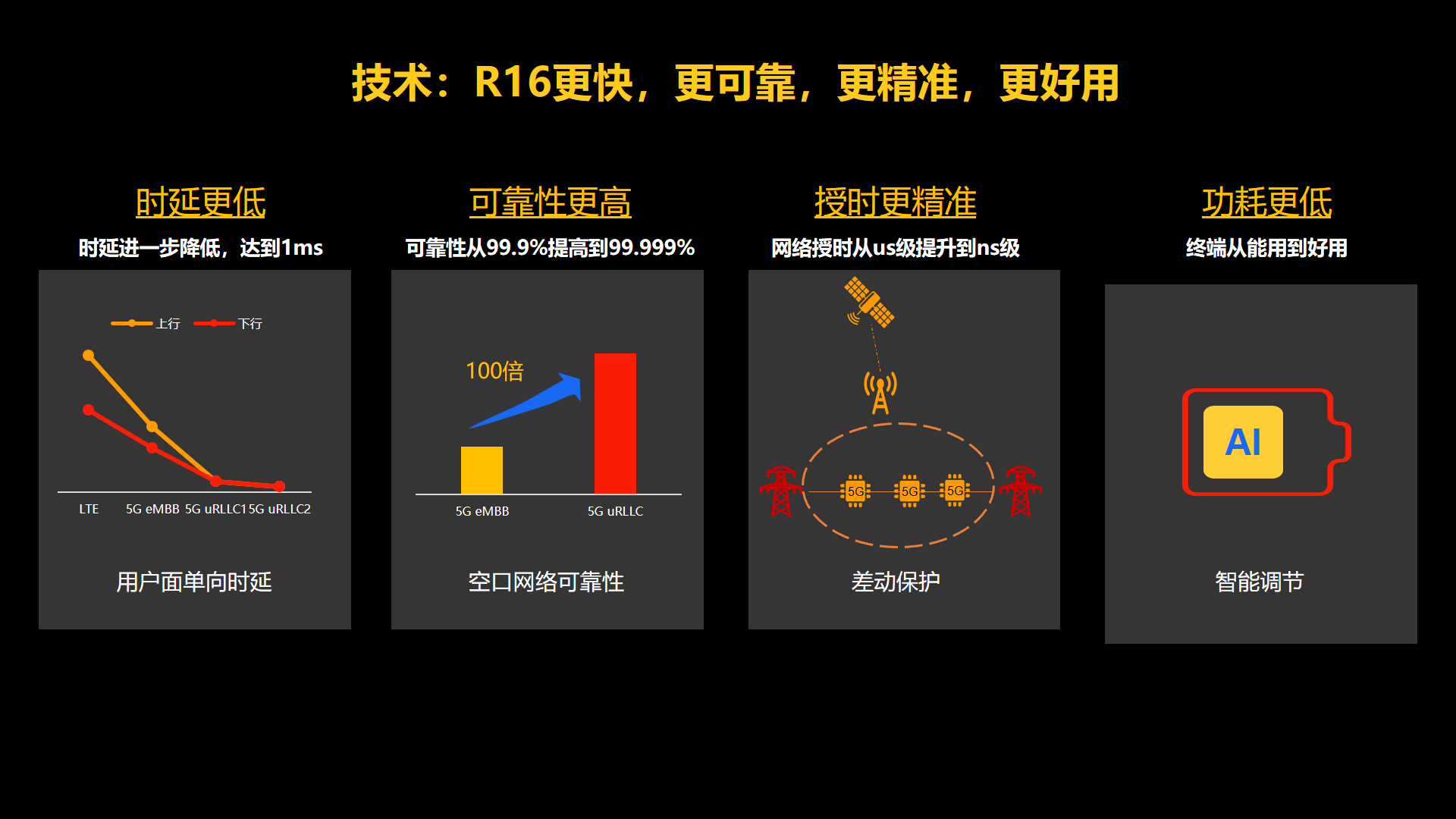 5G R16在超低网络延时、高可靠网络上做了增强:支持1微秒同步精度、1毫秒空口时延、可靠性达到99.999%、灵活的终端组管理,最快可实现5毫秒以内的端到端时延和更高的可靠性,提供支持工业级时间敏感等,功耗也大幅降低。一句话概括:R16更快,更可靠,更精准,更好用,能更好地支持5G+工业互联网的需要。