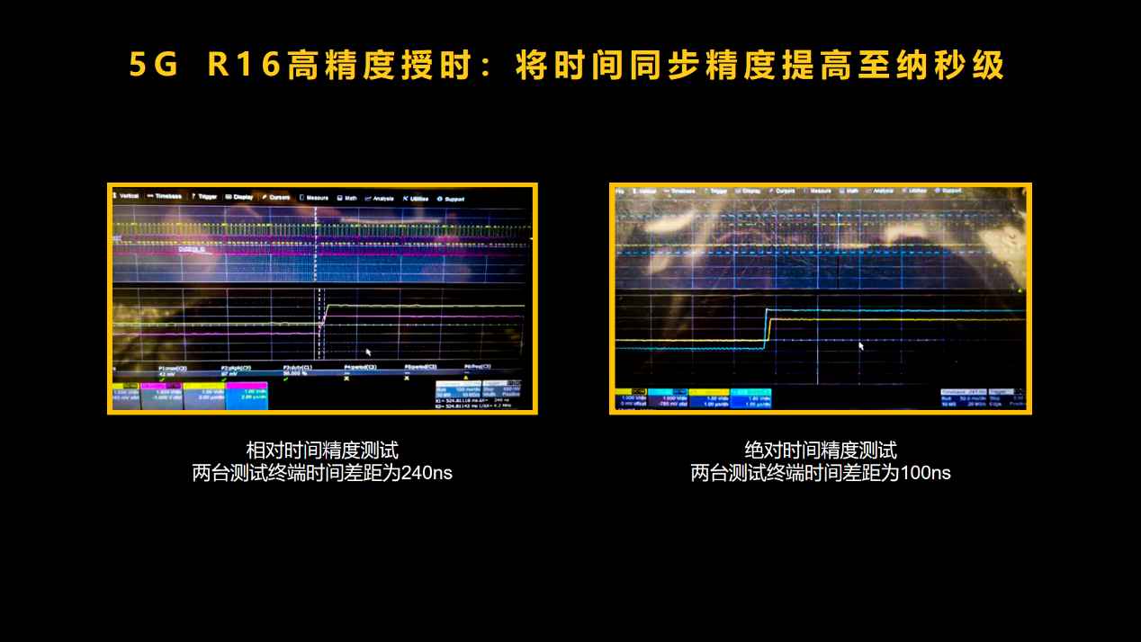 在今年7月,展锐联合中国联通,成功完成了全球首个基于3GPP R16标准的eMBB+uRLLC+IIoT(增强移动宽带+超高可靠超低时延通信+工业物联网)的端到端业务验证。从展锐展示的全球首个5G R16 Ready技术验证实测成果可以看到:5G R16高精度授时能将时间同步精度提高至百纳秒数量级。