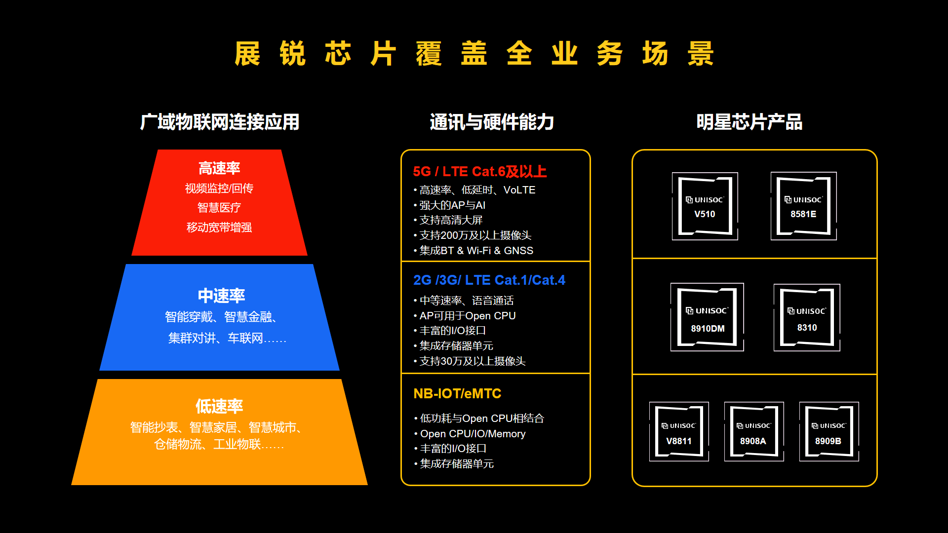 展锐工业电子以全场景连接技术为基础,将智能计算融入所有的产品中,为工业与社会的数字化转型提供底层技术。展锐拥有包括5G在内的几乎全部广域和局域网络连接技术和芯片产品,还有在智能显示、行业智能设备等产品领域布局。