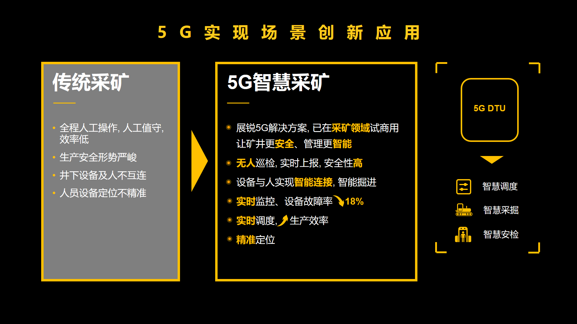 5G通信技术能够助力安全生产,劳动环境以及生产作业环境的改造和监控。基于展锐5G芯片的模组以及DTU设备能够协助打造智慧采矿的数字化解决方案,在降低18%设备故障率的同时,也让矿井作业更安全,管理更智能,并给采矿企业带来明显效益提升。