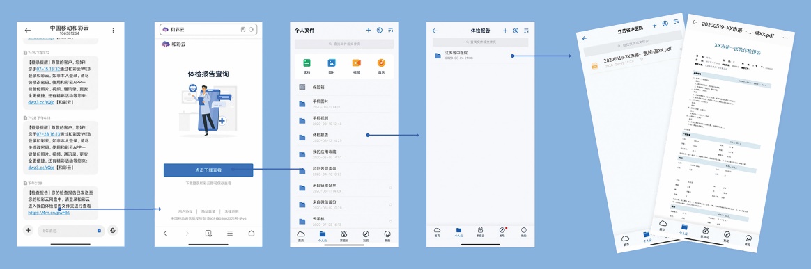 在江苏,中移互联网联合江苏移动市场部、政企部,携手扬州、连云港两地卫健委及江苏省内十余家医院,借助和彩云安全、高效、准确的数据传输平台,接入医院体检报告数据,将用户健康资料电子版传输至和彩云的存储空间,并保存至个人和彩云空间,实现个人可随时线上查询、下载体检报告。对于用户个人,解决了以往需现场领取报告、纸质携带不便、易丢失难保存、跨医院难互认等难题;对于医疗机构,解决了存储资源紧张,患者资料难以长期保存的问题。目前,和彩云网盘已推送医疗报告超2.5万份,随着接入合作医疗机构的增加,将为更多用户提供医疗健康信息化服务。