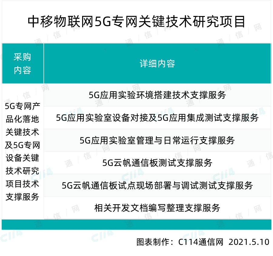 据了解,中移物联网公司5G专网关键技术研究项目,所采购的主要内容包括:5G专网产品化落地关键技术及5G专网设备关键技术研究项目技术支撑服务,详细支撑服务内容如下: