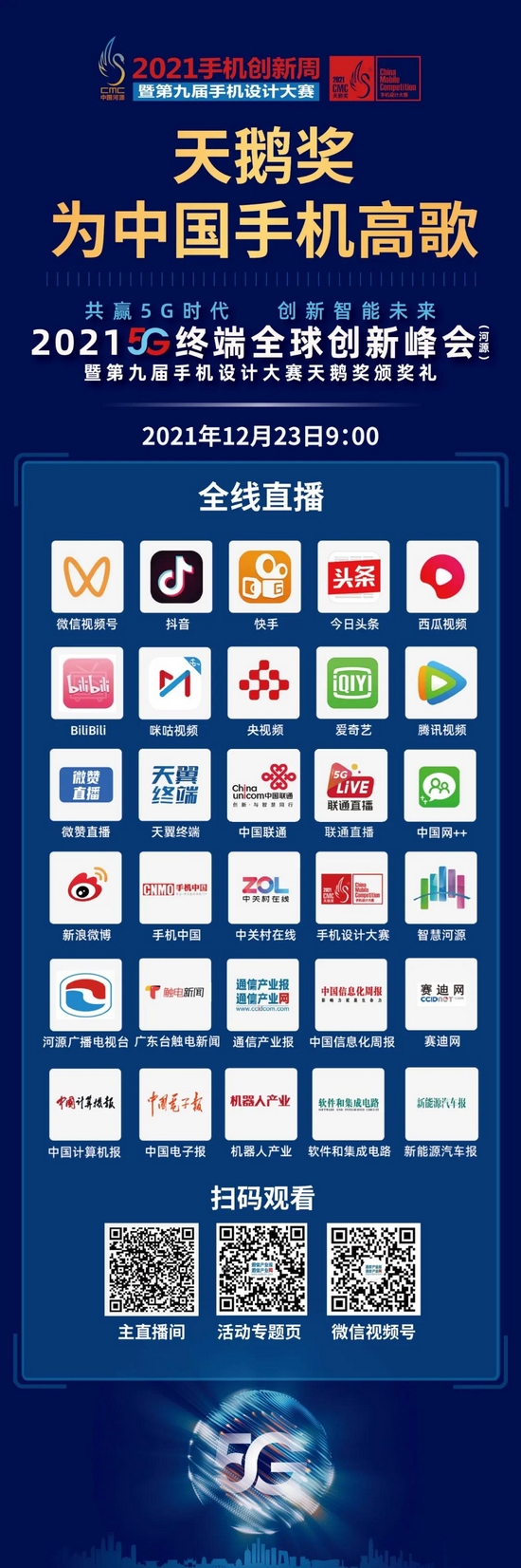2021年手机创新周暨第九届手机设计大赛落地收官活动——2021 5G终端全球创新峰会(第三届)暨第九届手机设计大赛天鹅奖颁奖礼将于12月23日以线上方式在手机生态良好栖息地——河源国家高新区国际会议中心云端举行,备受关注的中国手机最高奖——天鹅奖亦将隆重揭晓。